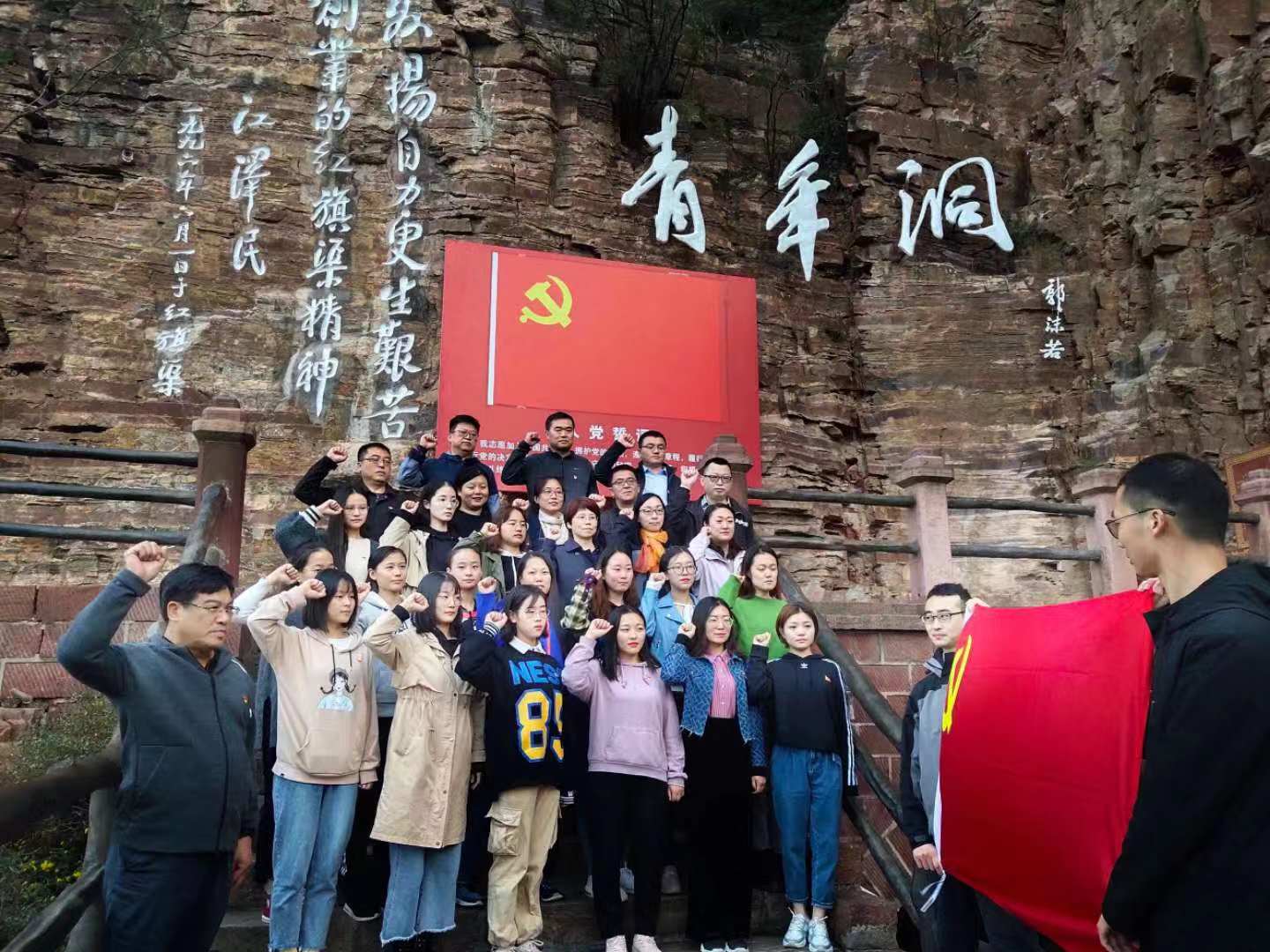 现场教学后,我们沿着前人的足迹,重走红旗渠。创业路沿途到处可见险峻的峭壁,俢渠之难,可见一斑。青年洞前,甘建青书记领誓,带领参加此次教育活动的全体党员对着党旗,重温入党誓词。大家深情地演唱了《我和我的祖国》,将一支红歌,献给我们亲爱的党和我们伟大的祖国。