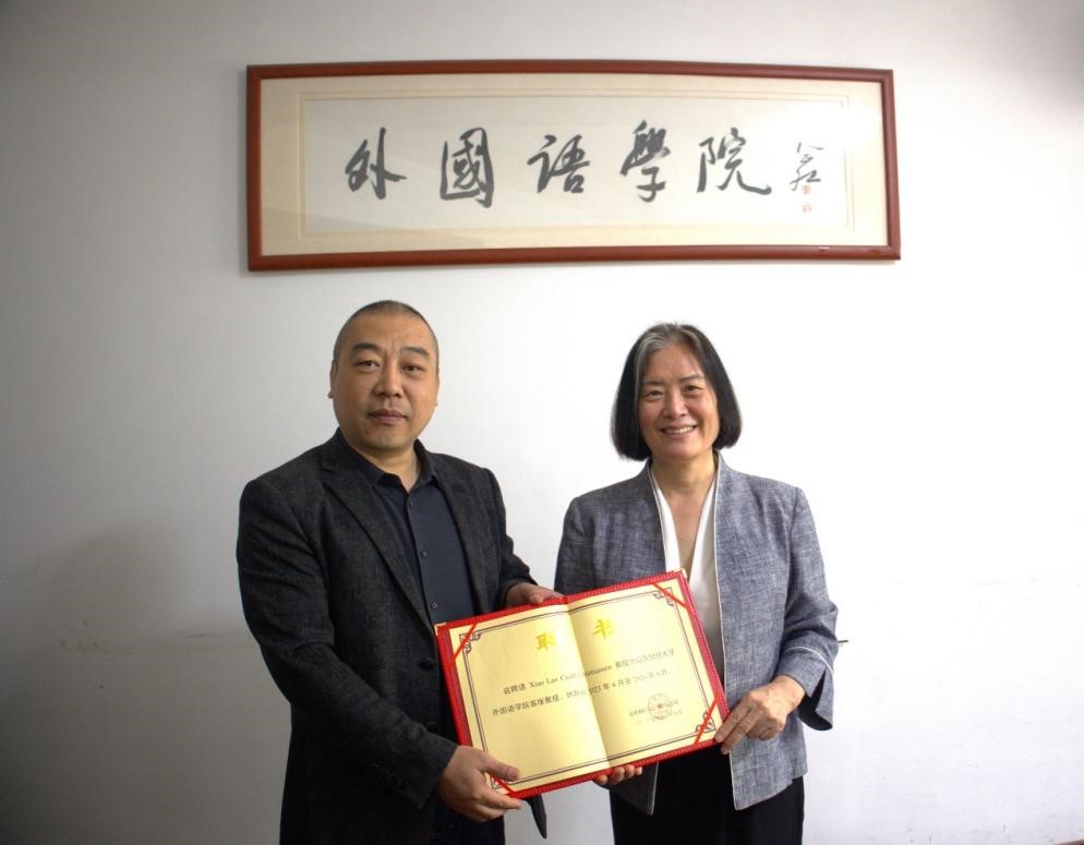 学院聘请Xiao Lan Curdt-Christiansen为台湾A片 客座教授,于秀金为Xiao Lan Curdt-Christiansen颁发聘书。