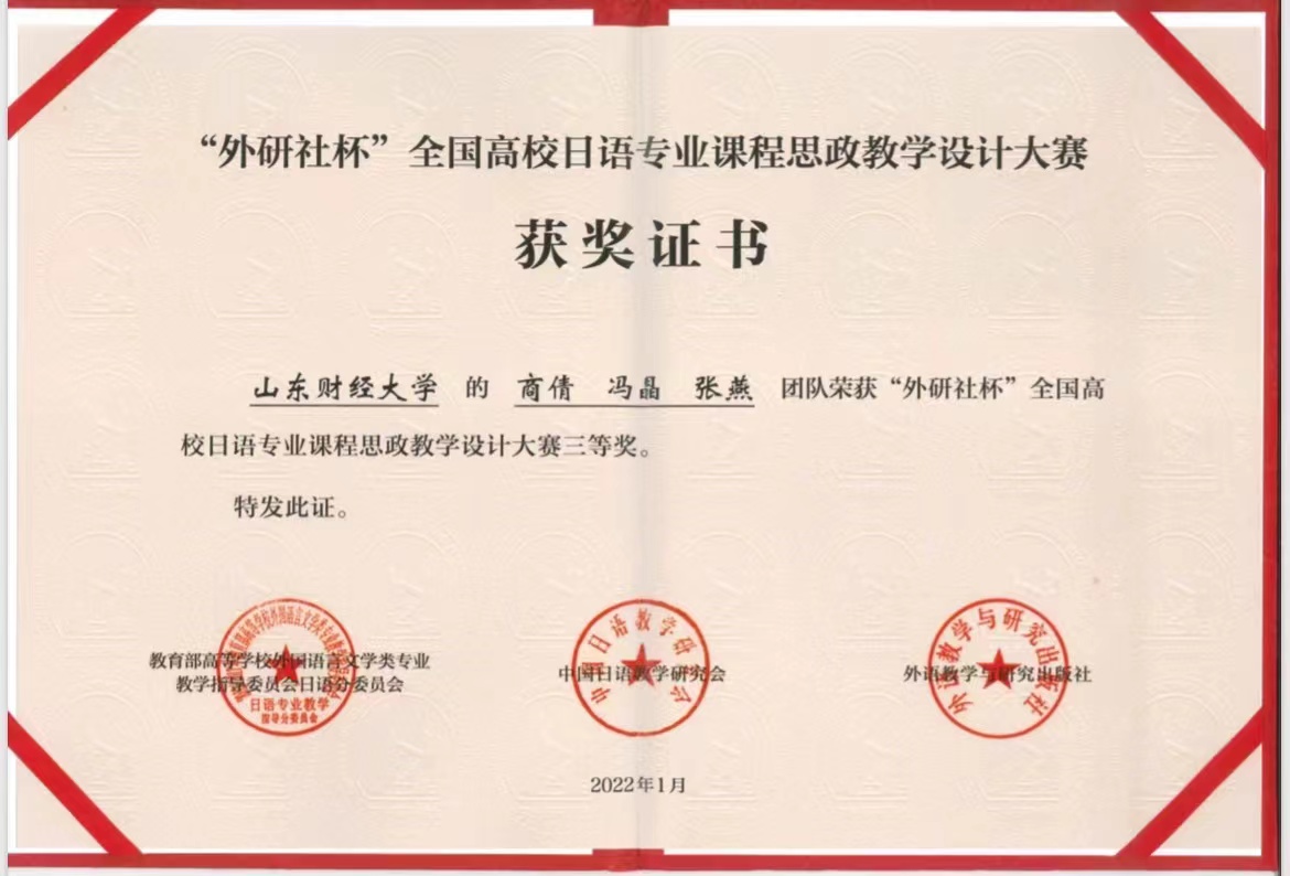 近日,首届“外研社杯”全国高校日语专业课程思政教学设计大赛结果公布,本次大赛共有来自全国高校的106支参赛队伍参加。经过专家评审与网络投票的激烈角逐,台湾A片 日语系商倩博士主讲的参赛作品脱颖而出,斩获三等奖。
