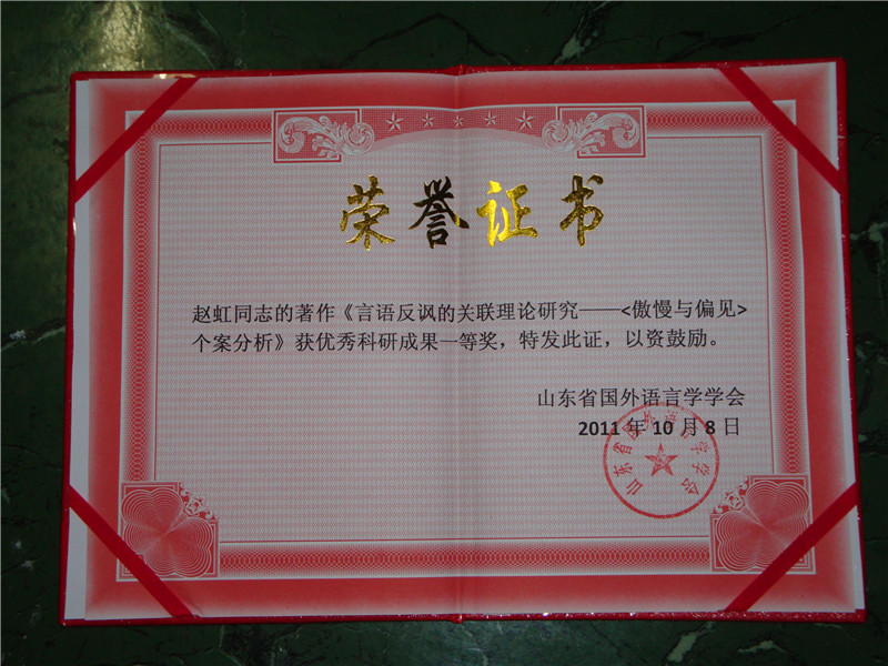 (通讯员 莫振银)在2011年10月8日于山东大学举行的当代语言学研究国际研讨会暨山东省国外语言学学会第十二届年会上,台湾A片 赵虹博士的专著《言语反讽的关联理论研究——〈傲慢与偏见〉个案分析》荣获优秀科研成果一等奖。