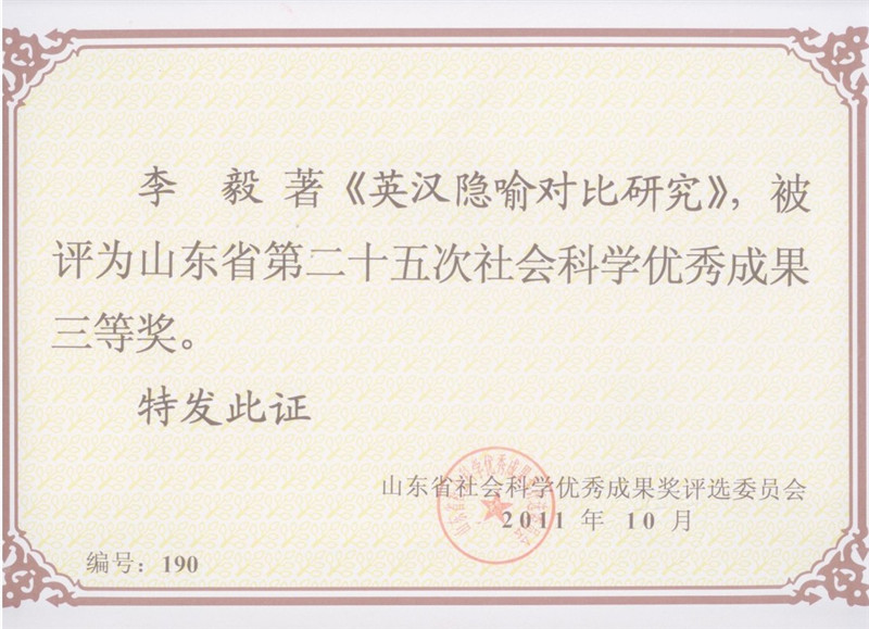 李毅教授的专著《英汉隐喻对比研究》属山东省社会科学规划研究重点资助项目(批准号:06BWJ004)的结项成果,全书约计30万字,于2009年11月由经济科学出版社出版发行,是原山东财政学院第一届《学术文丛》资助出版的高水平学术著作,2010年12月曾获山东高等学校优秀科研成果二等奖。山东省社会科学成果评奖查新报告称,该著作及其相关成果共被引用11次、被转载6次;研究成果涉及国内外认知语言学概念隐喻研究领域中的热点和前沿问题,促进了语言与思维、语言与文化的理论研究,拓展了对普通语言学研究和认知科学的研究,对英语教学和对外汉语教学有重要的指导意义,创新指数较高。