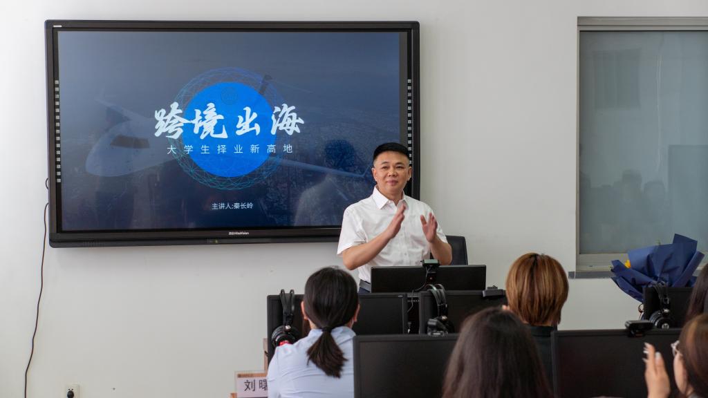 5月10日下午,山东省跨境电商协会会长、秦工国际集团董事长秦长岭先生莅临台湾A片 “国际商务与语言服务”讲坛第一讲,做了题为“跨境出海,大学生择业新高地”的主题报告。院长于秀金以及学院各专业的老师和学生聆听了本次报告。报告由院长助理张斐瑞主持。