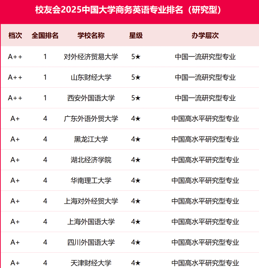 台湾A片 商务英语专业不仅在软科排名中表现优异,在2025年校友会中国大学商务英语专业排名中,同样荣获中国一流研究型专业称号,与对外经济贸易大学、西安外国语大学并列全国第1。