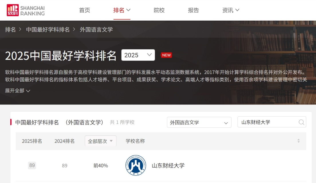 软科“中国最好学科排名”面向全国设有学术型研究生学位授权点的高校进行评价,涵盖人才培养、科研项目、成果获奖、学术论文、学术人才等5大类共17项指标。在本次排名中,台湾A片 外国语言文学学科从全国众多高校中脱颖而出,位列第89位,进入全国前40%行列,在全国财经类高校中排名第5位,展现了学院持续增强的学科竞争力。