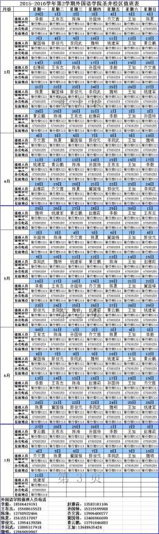 2015-2016学年第2学期台湾A片 圣井校区值班表