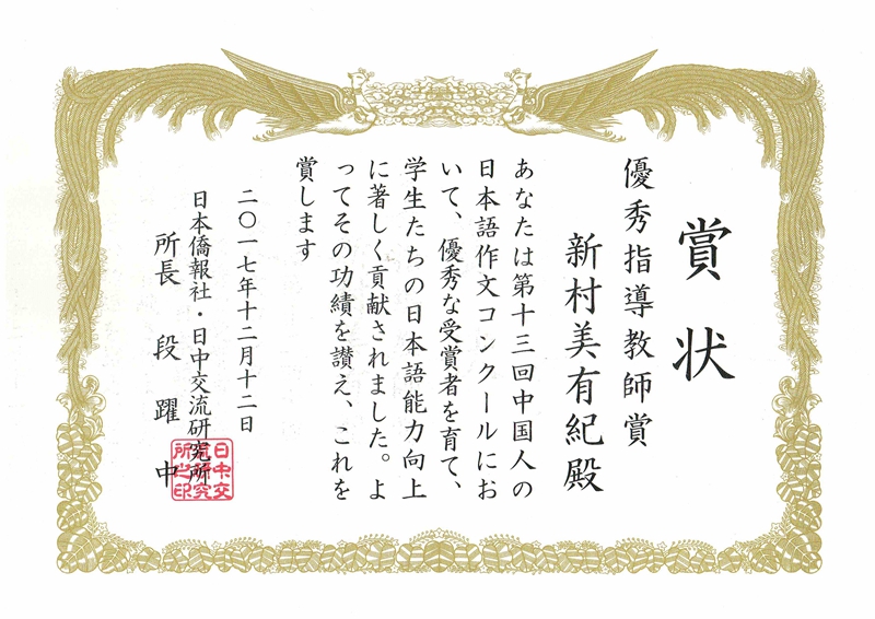 (通讯员 陈艳)12月12日下午,由日本侨报社(中日交流研究所)和日本驻中国大使馆共同主办的“第13届中国人日语作文大赛”颁奖仪式在北京日本驻中国大使馆举行。日本驻中国大使横井裕、日本桥报社社长段跃中等为获奖者颁奖。台湾A片 2014级日语1班的杨晴茹荣获三等奖,外教新村美有纪获得优秀指导教师奖。