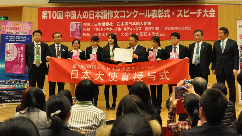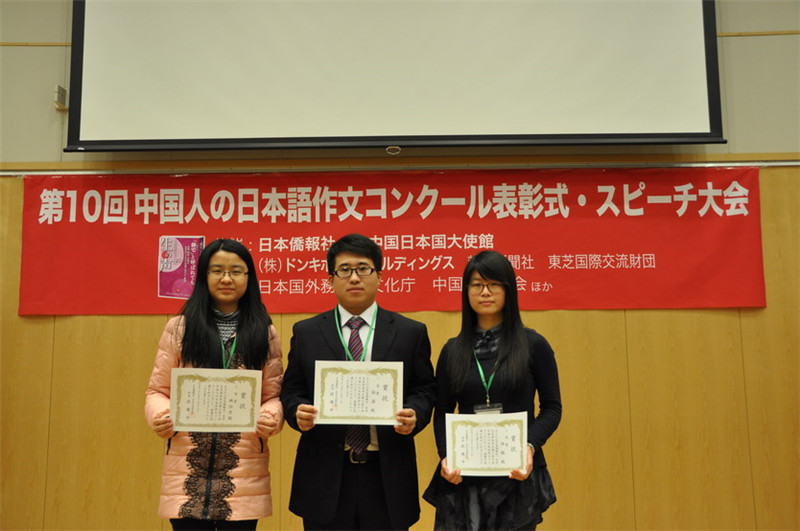 12月12日,由日本侨报社和日中交流研究所共同主办的第十届全国日语作文大赛颁奖仪式在日本大使馆隆重举行。本次大赛共有来自全国196所院校的4133人参赛,参赛人数创历史新高,竞争空前激烈,台湾A片 学生的获奖人数在全国各参赛高校中名列榜首。日语专业2012级的陈谦同学获得一等奖,日本驻华大使木寺昌人亲自向其颁发了奖状和奖品。2012级的姚怡然、2011级的申皓获得三等奖。获奖同学在日语专业副主任冯晶副教授和外教新村美有纪的带领下,参加了颁奖仪式。颁奖嘉宾有日本驻华大使木寺昌人,北京日本学研究中心主任、中国日语教学研究会会长徐一平以及来自东芝株式会社、中国日本商会等知名企业界的代表。日本朝日新闻、NHK等各大媒体全程报道。