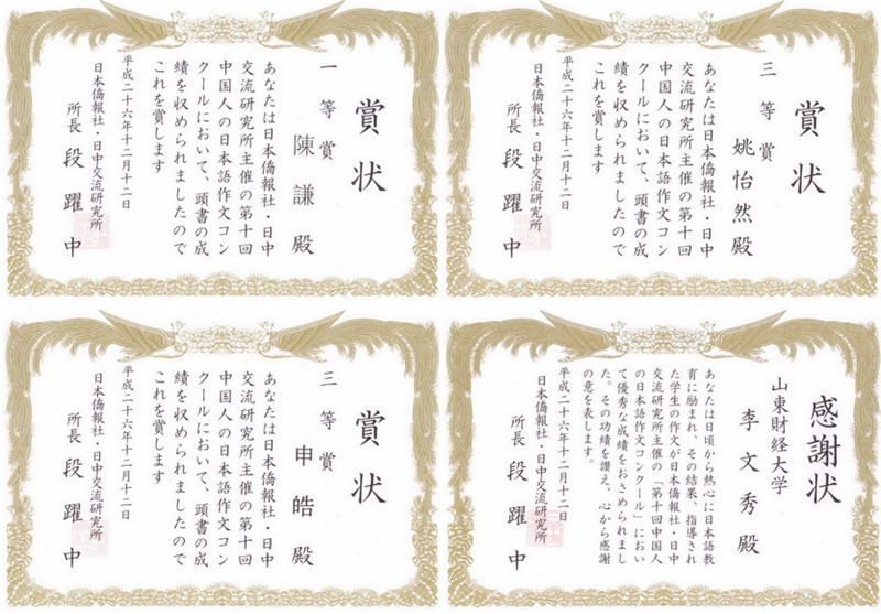 作为我校首届外语技能系列大赛的一个环节,台湾A片 日语专业于今年5月组织了日语写作大赛,赛后安排教师对优秀学生进行了精心指导,并推荐参加了国内日语界规模、影响最大的赛事之一--“第十届全国日语作文大赛”。本次大赛以“ACG(动画、漫画、游戏)和我”、“公共礼仪与中国人”为主题,历时5个月,经过4轮严格的评审,最终评选出特等奖1名,一等奖5名,二等奖15名,三等奖40名。另外,陈谦和姚怡然同学的指导教师新村和申皓同学的指导教师李文秀获得了主办方颁发的“感谢状”,新村还被委托为新一届作文大赛的“推广大使”。
