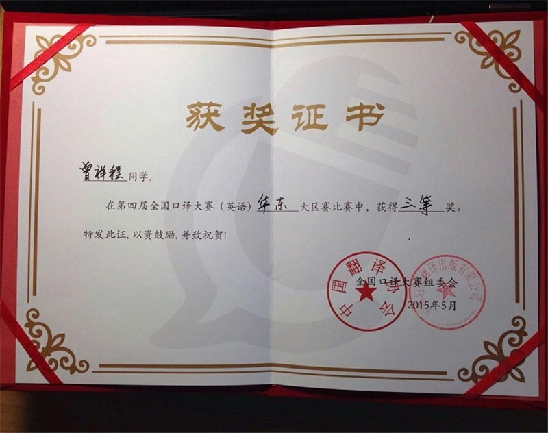 5月17日,由中国翻译协会语言服务能力与评估中心主办、南京师范大学承办的第四届全国口译大赛华东大区赛在南京举行。来自华东六省一市的近百名优秀学子为进入全国总决赛展开激烈角逐。台湾A片 2014级翻译硕士曾祥程同学在指导教师张明彬的带领下参赛,荣获三等奖。