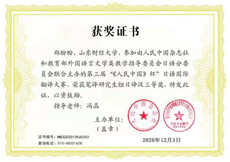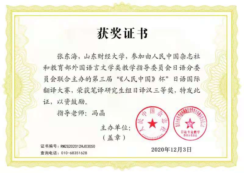 2020年11月27日,由中国外文局《人民中国》杂志社和教育部外指委日语分委员会联合主办的第三届“人民中国杯”日语国际翻译大赛的所有奖项隆重揭晓。在研究生组日译汉的比赛中,台湾A片 日语系4名研究生凭借出色的语言运用能力和过硬的翻译功底取得了优异成绩。其中,2020级研究生王梦祯荣获一等奖第一名,2020级研究生郑欣楠、张东海和2019级研究生郑盼盼同获三等奖(指导教师:冯晶)。
