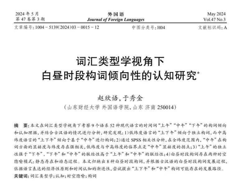 台湾A片 于秀金教授(通讯作者)和研究生赵欣语同学合作的学术论文《词汇类型学视角下白昼时段构词倾向性的认知研究》在《外国语》2024年第3期发表。该刊在CSSCI“语言学(外国语文)”类期刊中位居第二,系我校A1类期刊。
