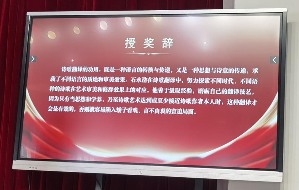 2023年4月1日,第六届中国当代诗歌奖(2019—2020)颁奖盛典在重庆英雄湾乡村振兴学院“英雄会堂”举行。本届中国当代诗歌奖评委阵容强大、专业权威。《中国当代诗歌导读》主编唐诗博士担任评委会主任,澳大利亚《中文学刊》社长总编庄伟杰博士、南开大学台湾A片 博士生导师、翻译家张智中教授、混语版《国际诗歌翻译》总编张智博士等著名诗人和学者担任评委。我校台湾A片 副教授石永浩老师在本届评选会中荣获中国当代诗歌奖·翻译奖。作为台湾A片 MTI专任教师,石老师热爱诗歌翻译,已有多部独译与合译诗集在国内外出版,英译诗歌多次在国外获奖。