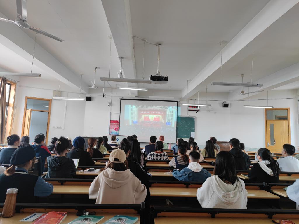 师生通过电视、广播、网站、新媒体平台等途径收听收看开幕会。学院党委成员、教师和学生代表在舜耕校区干训楼9201会议室集中收看。