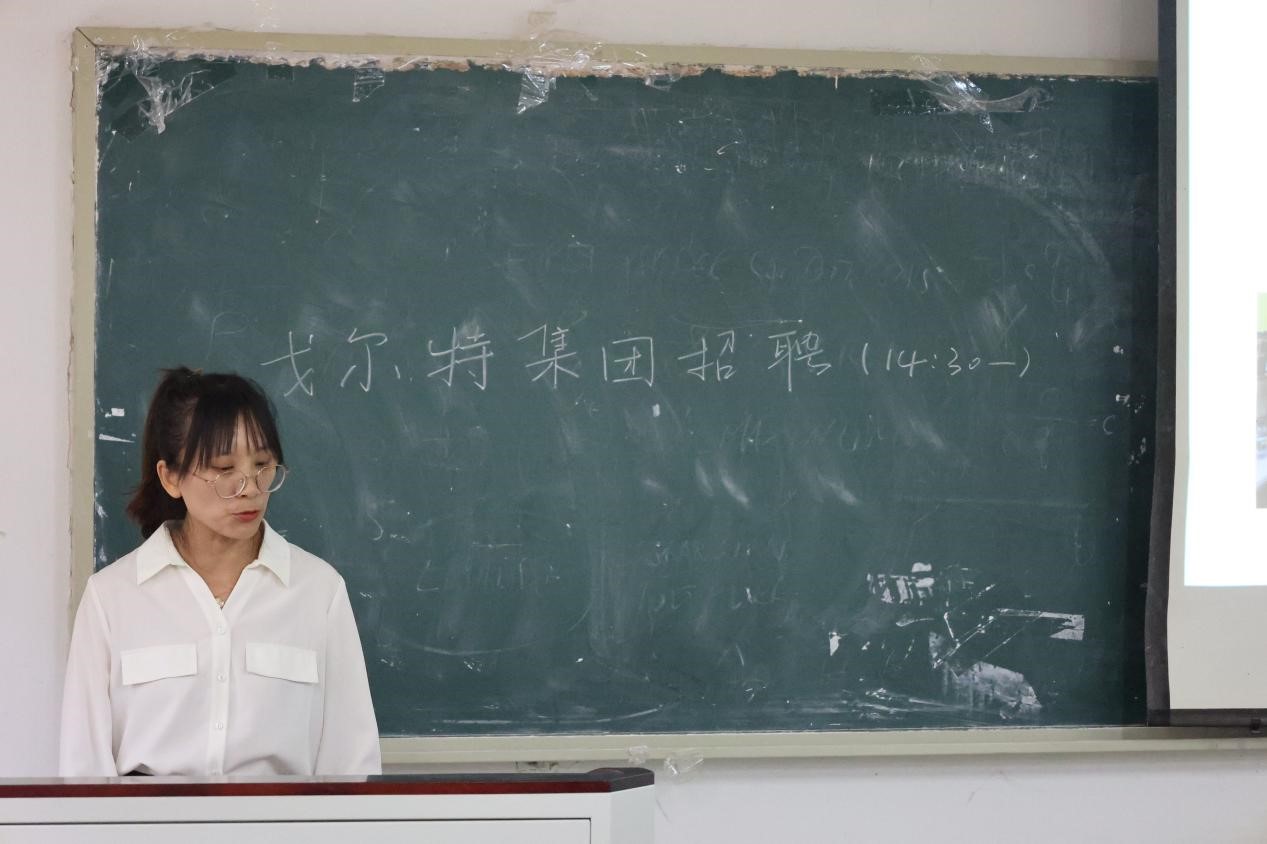会上,戈尔特集团人力资源负责人为同学们介绍了公司基本情况,围绕业务范围、发展平台、岗位需求和应聘方式等方面进行详细讲解。