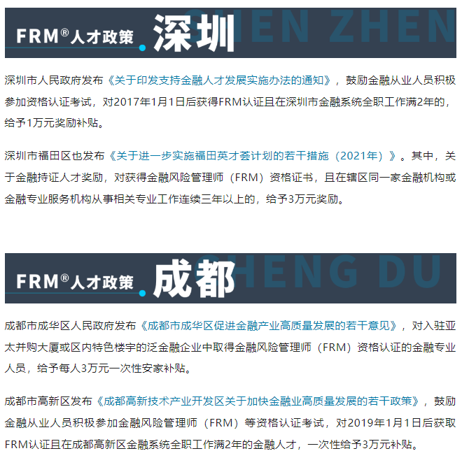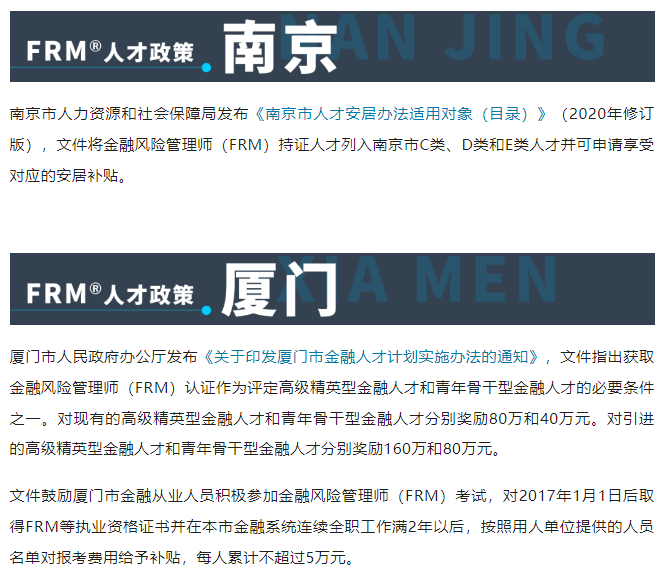 为吸引和鼓励金融高端人才与紧缺人才,许多省市出台了针对FRM持证人的政策福利,包括北京、上海、广州、深圳、南京、青岛、成都、西安、天津、杭州、宁波、厦门、武汉、南昌等。这些政策福利包括证书补贴、入户便利、培训支持,税收优惠等。