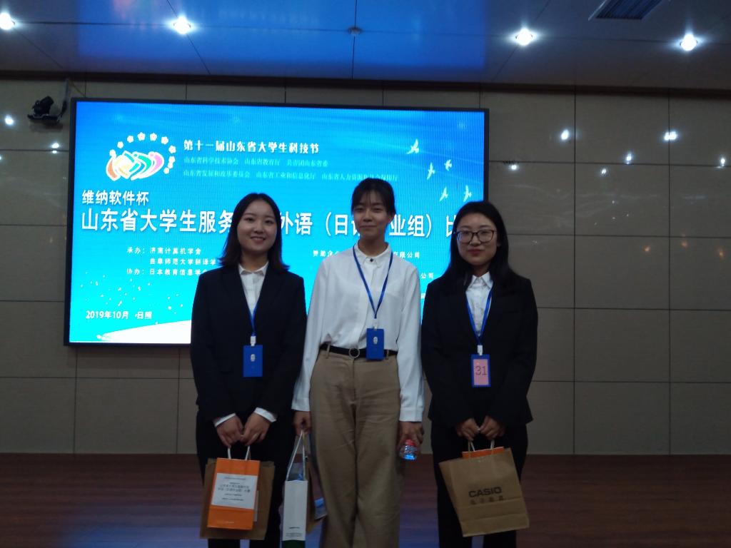 山东省大学生服务外包外语日语专业组大赛是“第十一届山东省大学生科技节”系列活动之一,由山东省科学技术协会、共青团山东省委员会、山东省发展和改革委员会、山东省教育厅、山东省工业和信息化厅、山东省人力资源和社会保障厅联合主办,山东省高教学会计算机教学研究专业委员会、济南计算机学会、曲阜师范大学翻译学院承办,日本教育信息学会协办,是山东省重要的日语专业赛事活动。比赛进行方式为现场日语即席演讲,会议前一天评委组商议决定即席演讲待选题目(5个),选手决赛上场前10分钟抽签决定演讲题目。日语专业2016级朱文星(指导教师王维维)、高夕婷(指导教师刘清哲)同学分获二等奖、于露(指导教师张燕)同学获得三等奖。