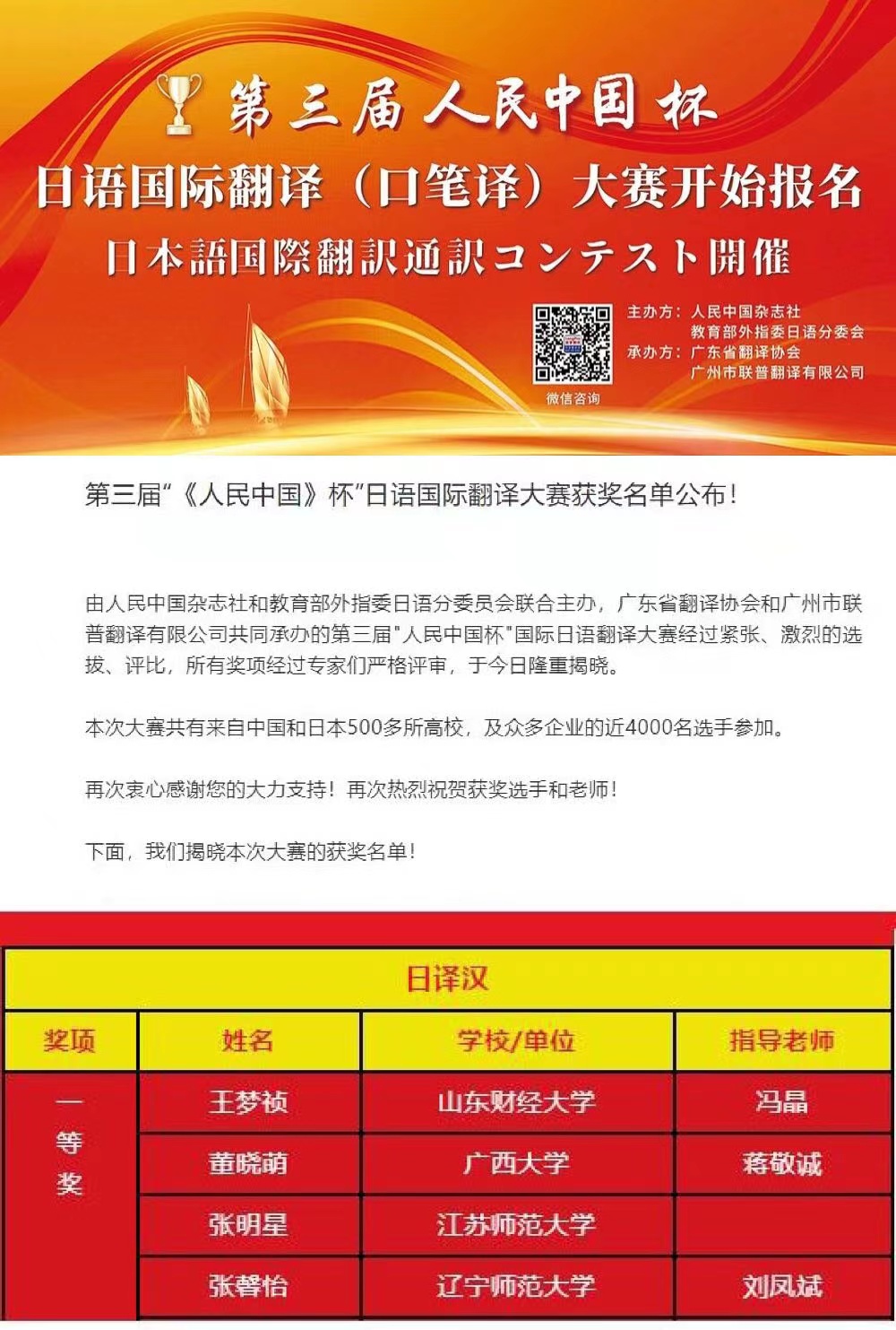 “人民中国杯”日语国际翻译大赛目前已举办三届,是我国影响最大、分量最重的日语翻译竞赛。本次比赛竞争十分激烈,共有来自中国和日本500多所高校和机构的近4000名选手参加,全国有日语专业点的高校参与率高达99%,在参赛规模和人数上均创造了历史。