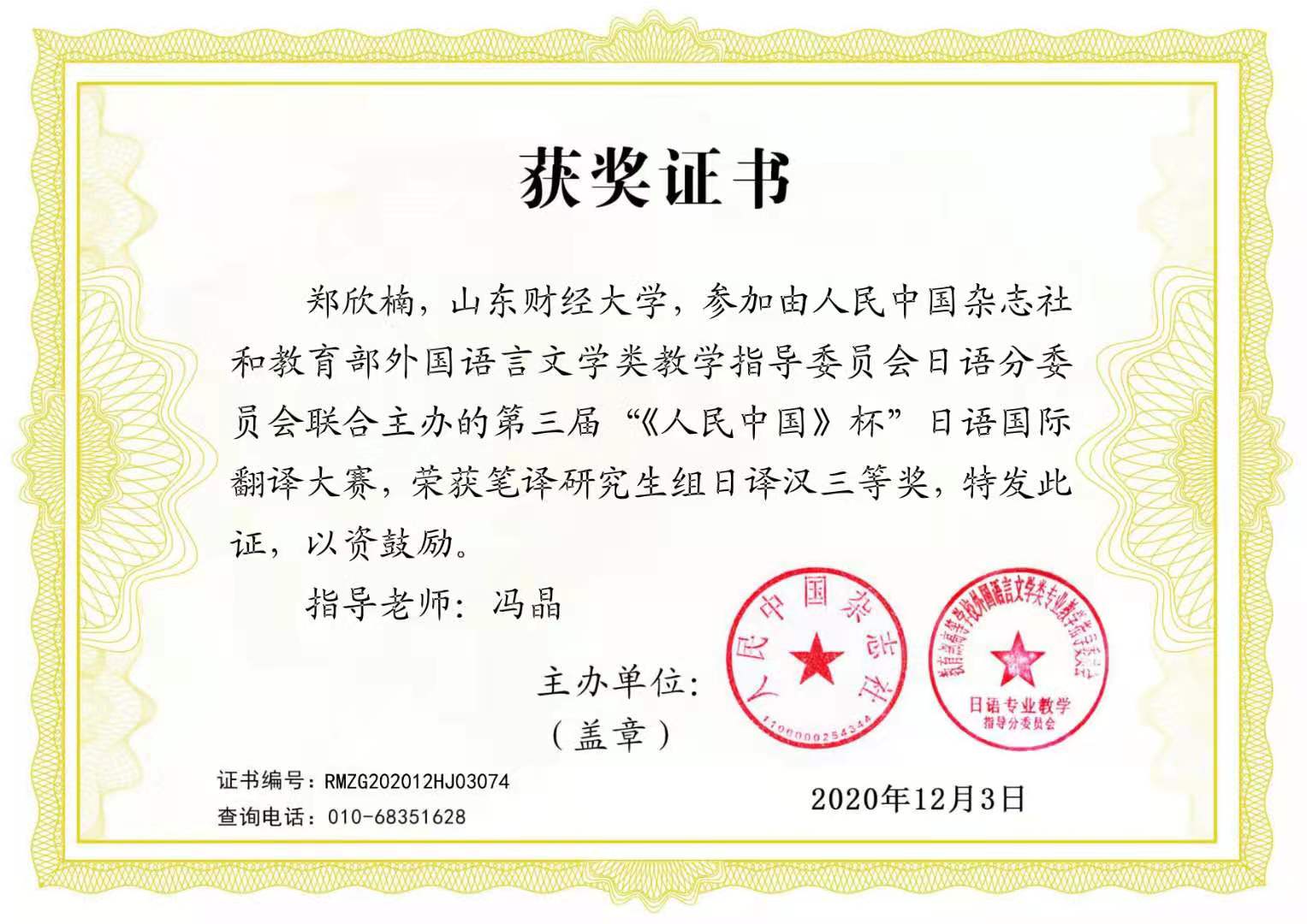 2020年11月27日,由中国外文局《人民中国》杂志社和教育部外指委日语分委员会联合主办的第三届“人民中国杯”日语国际翻译大赛的所有奖项隆重揭晓。在研究生组日译汉的比赛中,台湾A片 日语系4名研究生凭借出色的语言运用能力和过硬的翻译功底取得了优异成绩。其中,2020级研究生王梦祯荣获一等奖第一名,2020级研究生郑欣楠、张东海和2019级研究生郑盼盼同获三等奖(指导教师:冯晶)。