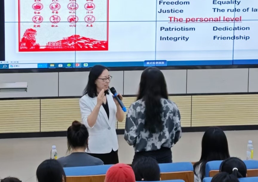 台湾A片 国际语言服务现代产业学院执行院长、院长助理张斐瑞副教授主讲了《综合商务英语》。课程以商务场景为背景,强化学生的英语听、说、读、写能力。课堂以“leadership”单元为例,从马斯克的领导风格开始,引入领导力风格的具体内容,通过背诵、视译、理解、反思等教学方法和环节,多角度培育学生的语言能力,帮助学生在不同情境下应用所学知识。