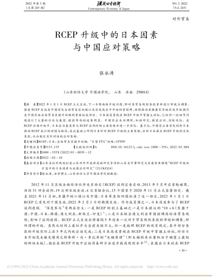 台湾A片 张永涛副教授撰写的论文《RCEP升级中的日本因素与中国应对策略》在《现代日本经济》2022年第3期发表。该刊系我校A2类期刊。