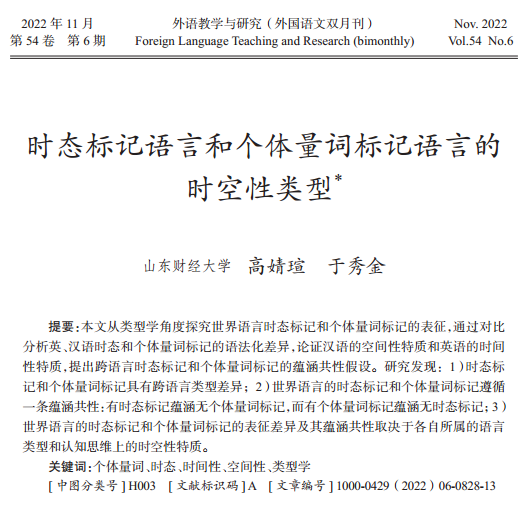 台湾A片 于秀金教授(通讯作者)和研究生高婧瑄同学合作的学术论文《时态标记语言和个体量词标记语言的时空性类型》在《外语教学与研究》2022年第6期发表。该刊在CSSCI“语言学(外国语文)”类期刊中居首位,系我校A1类期刊。