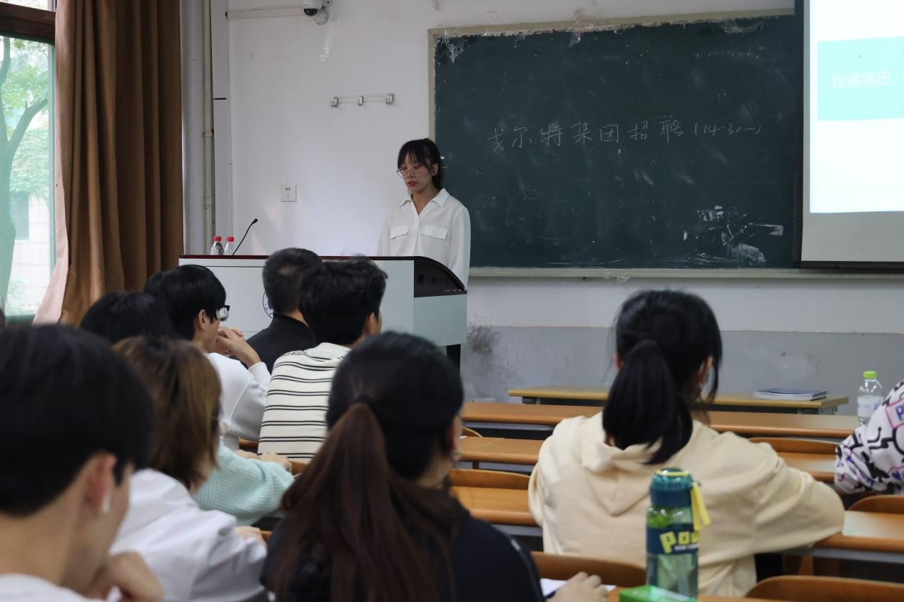 会上,戈尔特集团人力资源负责人为同学们介绍了公司基本情况,围绕业务范围、发展平台、岗位需求和应聘方式等方面进行详细讲解。