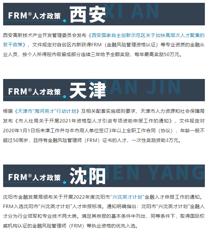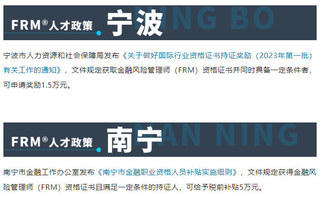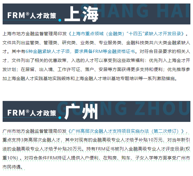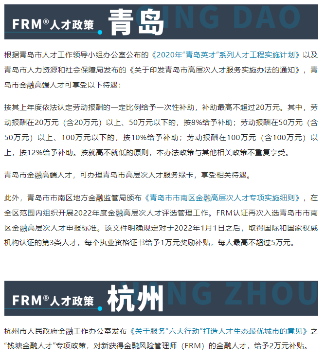 为吸引和鼓励金融高端人才与紧缺人才,许多省市出台了针对FRM持证人的政策福利,包括北京、上海、广州、深圳、南京、青岛、成都、西安、天津、杭州、宁波、厦门、武汉、南昌等。这些政策福利包括证书补贴、入户便利、培训支持,税收优惠等。