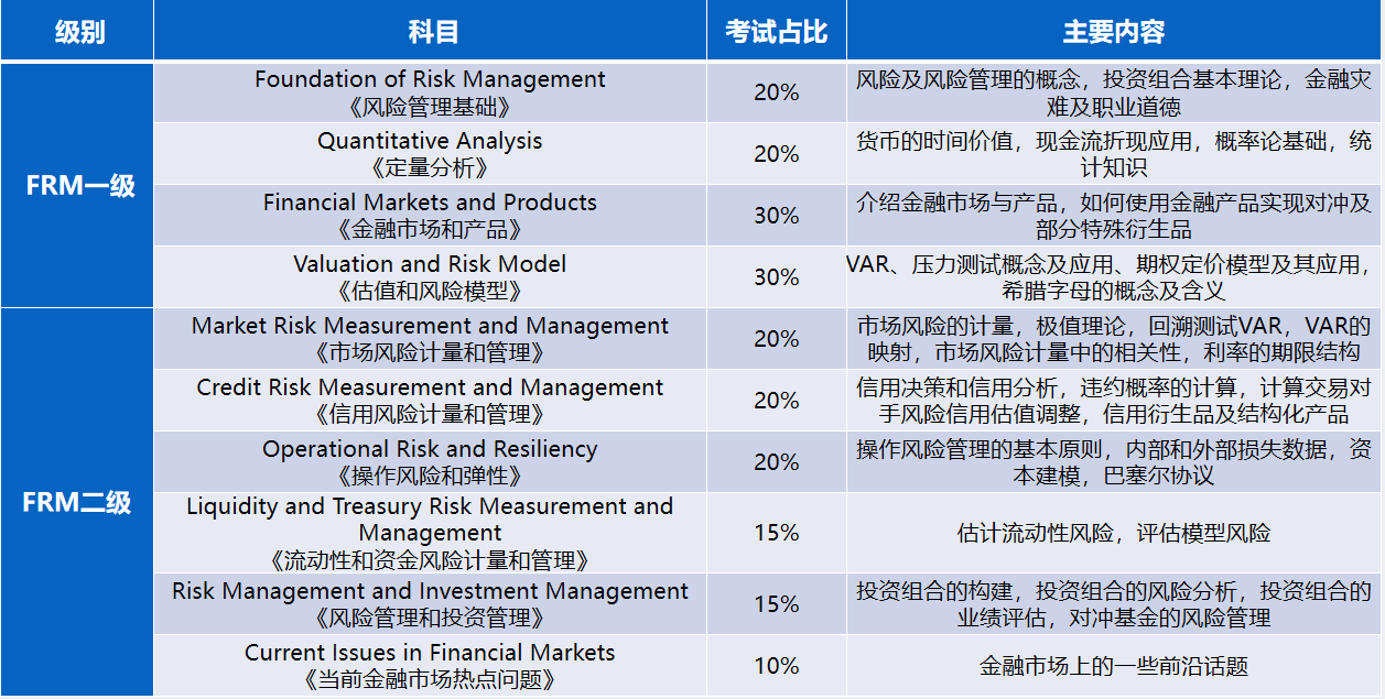 FRM认证由GARP组织命题、考试并颁发证书,其偏重介绍风险管理分析和决策的必要知识体系,采用全英文考试。