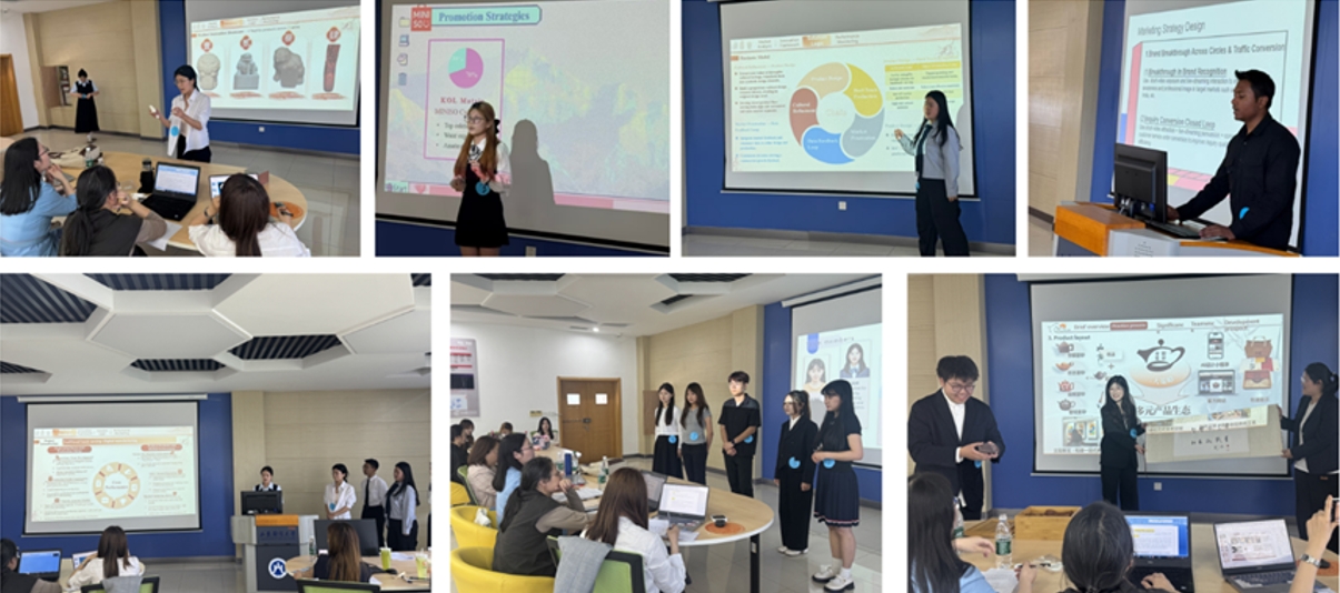 大赛对接iCAN国赛标准,要求参赛团队围绕企业实际需求,完成“跨境数字营销策划方案+创意短视频”的全流程设计,并通过英文路演汇报展示项目成果。11日下午的比赛现场精彩纷呈,各参赛团队创意不断、亮点突出,通过流利的英语口语、专业的PPT设计展示了一场视觉盛宴。如紫砂云创团队将宜兴紫砂工艺与跨境电商结合,提出文化产品数字化推广方案;淄韵染彩团队基于淄博传统染坊技艺,设计非遗文化跨境供应链;大“名”星打造计划团队构建虚拟明星IP矩阵,探索人格化品牌出海新路径。其他方案还涉及AI跨境选品系统、跨文化宠物IP营销等创新方向,充分体现“专业+语言”复合型人才培养特色。