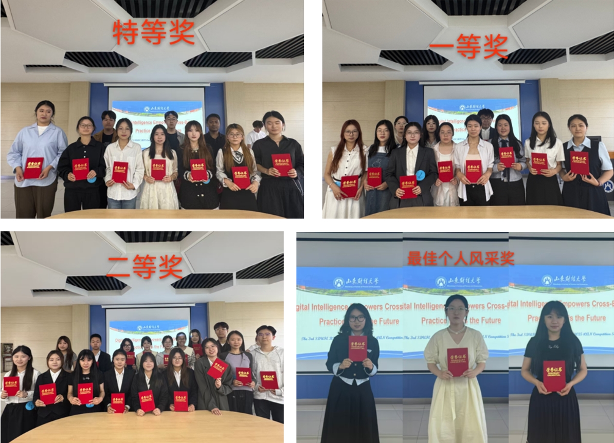 经过路演展示与答辩环节,最终评选出9支队伍分别获得特等奖2项、一等奖3项、二等奖4项。特等奖:大“名”星打造计划队、光刃无阻队;一等奖:HA跨境冲锋队、紫砂云创队、敢当Can Try队;二等奖:茶颜悦色全球种草计划、淄韵染彩队、萌爪跨境局队、蘑菇力队。邓思佳、姚懿轩、张毓容三位同学获得最佳个人风采奖。
